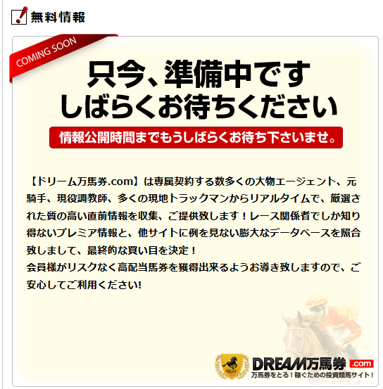 また、ドリーム万馬券.comの情報は、キャンペーンのほうが本命でこちらが競馬関係者からの裏情報の中でも「勝てる」情報を扱っています。