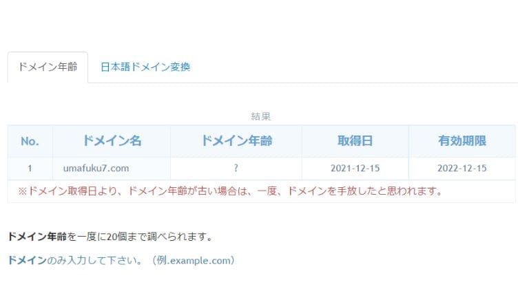 競馬予想サイト「馬福神」のドメイン「umafuku7.com」のドメインを調べると、2021年12月15日に取得されたドメインとなっています。
